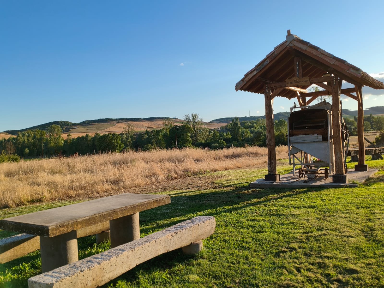 An aerial view of a rural landscape featuring an intricate network of green agricultural fields divided by narrow water channels. A small village with dense housing is nestled in the center, intersected by a meandering river. Roads with a roundabout can be seen connecting different parts of the area, providing a sense of connectivity.
